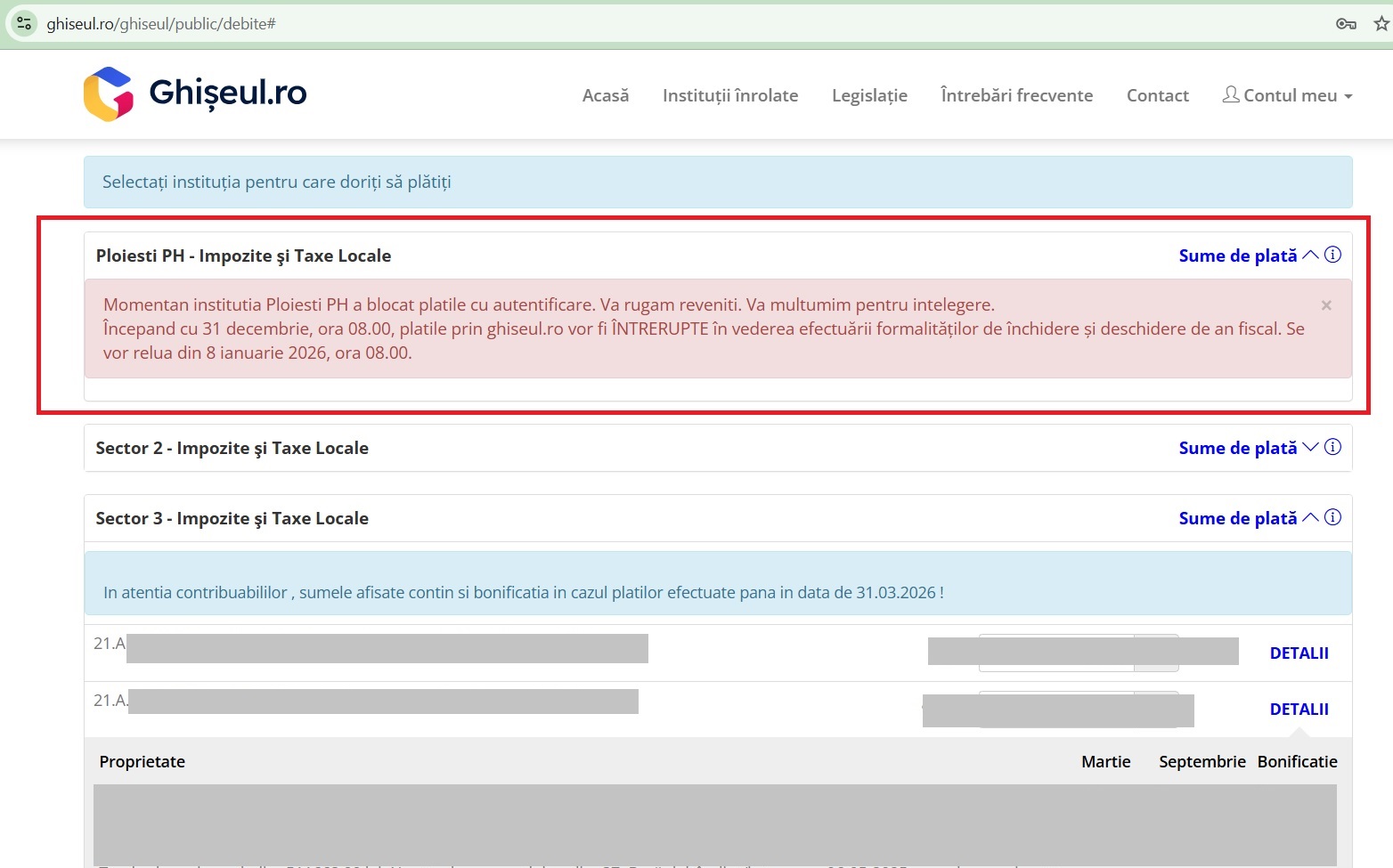 La Ploieşti şi Urlaţi plăţile cu autentificare sunt blocate; Primăria Ploieşti anunţă reluarea începând cu 08 ianuarie 2026, ora 08:00, iar SPFL şi sediile fiscale locale nu încasează taxe pentru anul 2026 până la acea dată. Sistemul a funcţionat dimineaţa, dar a devenit indisponibil pe parcursul zilei, afectând contribuabilii care intenţionau să plătească impozite şi taxe locale.
