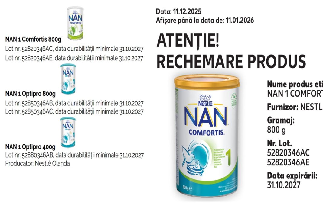 Loturile vizate includ diverse variante de NAN 1 Comfortis și NAN 1 Optipro, ambele în ambalaje de 400g și 800g. Consumatorii pot contacta Nestlé România pentru mai multe detalii prin telefon sau e-mail.
