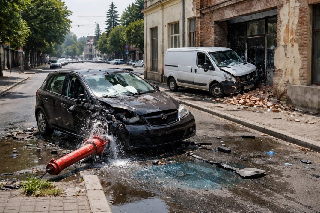 Accident spectaculos în Ploiești: autoturism vs autoutilitară, hidrant și clădire avariate